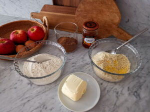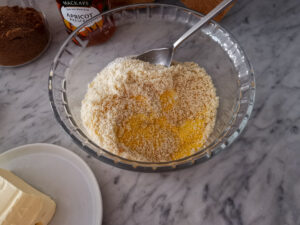 Have you ever made or tried the Sbrisolona cake from Mantua? It’s an interesting one featuring regular flour, polenta flour and ground almonds. It has a crumbly texture on top and it usually comes with no filling. However, we are making our own version with caramelized apples.