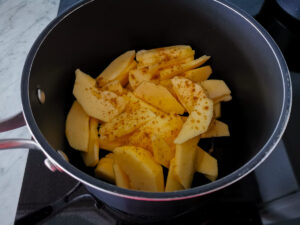 - Add the apples, the lemon juice, and the nutmeg and cinnamon to a medium pot and let them cook, over medium heat with the lid semi-closed.