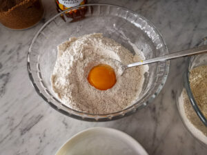 - Take two bowls. Put 200 gr flour 00 in one, and 100 gr in the other. The first bowl will be for the cake, and the second will be for the crumbled topping.