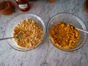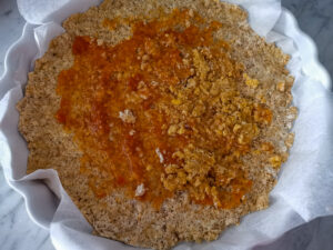 - Spread the dough in bowl 1 on the bottom of your baking dish.
