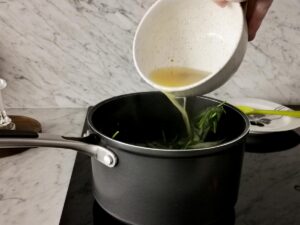 - Heat the water for your stock (1 litre) and melt the stock cube in it.