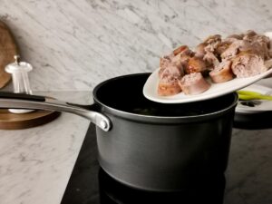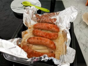 - Bake the sausage in the oven and once ready cut into pieces. Alternatively, you can remove the casing, cut into pieces and add it to cook with your stock.