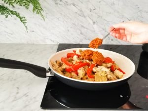 What to expect: Crunchy and soft vegetables, tender and juicy chicken bites, coated with a spicy Italian tomato and vegetables sauce from the southern region of Puglia. The fragrance will remind you of a caponata but this is not just a side dish, it’s a main course.