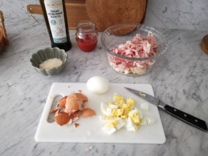 - Peel and cut the eggs, once cool, and add them to the bowl with the hams and cheese. Mix well.