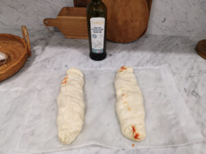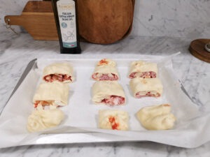 The inspiration for these pizza rolls comes from the Neapolitan pagnuttielli, a traditional street food sold by bakery apprentices known as “pagnuttellari” in the past. These round loaves, made with leftover bread dough and filled with ingredients like lard, salami, pecorino cheese, and pork cracklings, were a popular snack delivered to workers in the city from neighborhood bakeries.