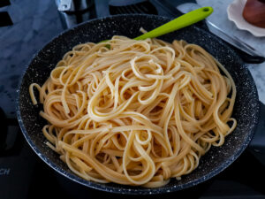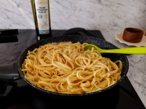 - Transfer the drained linguine to the pan where you sautéed the garlic in olive oil.