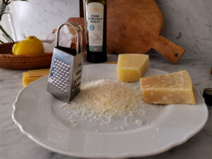 - Grate your pecorino and parmesan cheeses. You can combine them.