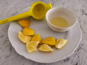 - Squeeze the juice out of your lemon and set aside in a bowl.