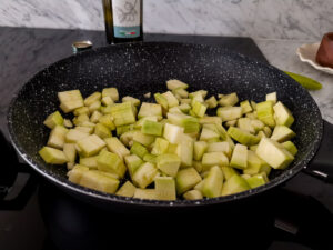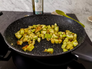 - Add both to a pan and sauté with 2 tablespoons of Belmorso EVOO. Continue tossing them from time to time until the zucchini have cooked fully.