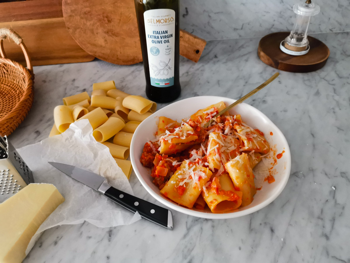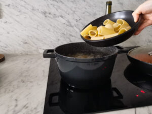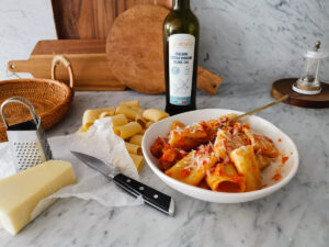 If you are asking why we used paccheri instead of rigatoni or ziti tagliati, since we stock both of those, here’s the answer. We love paccheri, and we are dedicating this month to paccheri recipes, showing you how versatile this chunky short pasta can be.