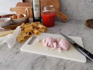 The traditional ingredients in Pasta alla Zozzona are those found in Carbonara, Amatriciana, and Cacio e Pepe dishes. This includes pasta (usually a tubular one), pancetta, guanciale, pecorino cheese, Parmigiano cheese, eggs, black pepper, tomatoes, and chili.