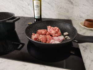 - Add to the pan together with the guanciale. Break the sausage into pieces after removing the casing. Add a drizzle of Belmorso EVOO, and sauté all together. Lower the heat.