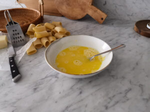- Separate the whites from the yolks, and add the yolks in a bowl. Grate some pecorino in that bowl (about 2 tablespoons), and add 4 tablespoons pasta cooking water.