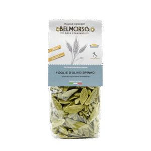 Belmorso Foglie d’Ulivo is a durum wheat pasta in the shape of an olive leaf. This pasta is blended with spinach and makes a delicious
