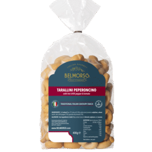Belmorso Tarallini al Peperoncino with Chilli and Tomato are a tasty, crunchy and versatile snack full of flavour. A healthy alternative to bread or bread