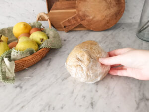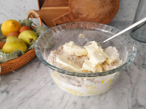 - Add the butter into small pieces. Use a fork to work it into the dry ingredients. Then wash your hands and work the dough for a minute or two with your hands, until you obtain a ball of soft dough.