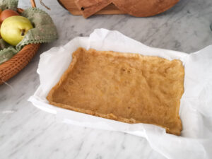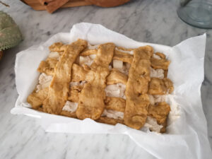 - Use the remaining dough to cut thin or thicker strips of dough and form a crostata crisscrossed shape on top of your pear and ricotta tart.