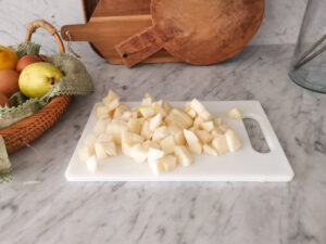 - Wash and peel the pears, cut them into 4 quarters, remove the inside stem and seeds, and cut them into small cubes (about 1 cm or smaller).