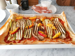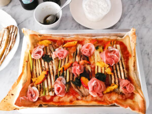 Almost any vegetable can be delicious on pizza when used appropriately. Popular choices include bell peppers, red onions, mushrooms, spinach, and tomatoes. The garden veggies used in our pizza recipe, along with the combination of ricotta and prosciutto, create a fresh and vibrant topping that’s both colorful and flavorful.