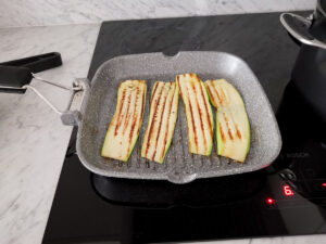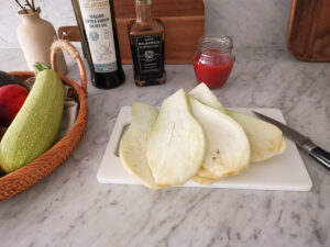 - Wash the courgette & cut lengthwise. You can slsice and cook it all or just half, which is what you'll need for one pizza.