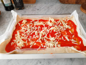 - While the vegetables cook, open the dough and layer it on your baking dish, covered with baking paper.