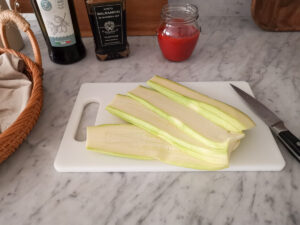 - Do the same with the aubergine, but I suggest you remove the skin, and consider soaking it in water if you don't like its bitterness.