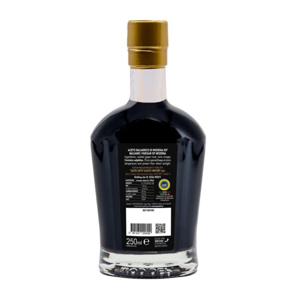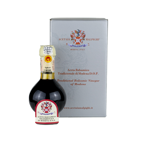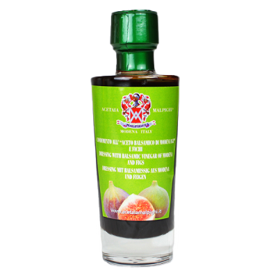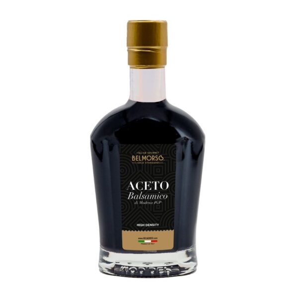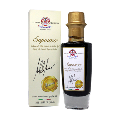 Belmorso IGP Balsamic Vinegar of Modena is obtained from cooked grapes must. The grapes must and wine vinegar has been aged for a long time in French oak barrels. It has a high density (1,34) and a sweet-sour flavour with fruity shades as well as intense perfume. A product 100% made in Italy. The production cycle from the grapes cultivation to the final product is entirely supervised by the Malpighi Family in Modena.