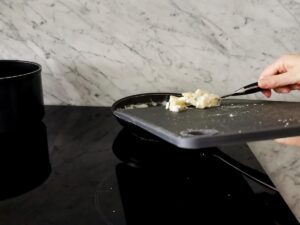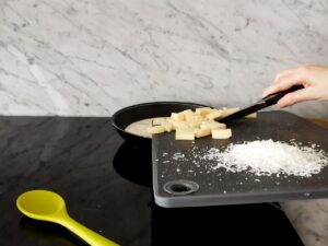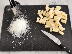 - Cut your emmental cheese into small cubes. PS: If you don't like chunks into your cheese sauce, then you may want to grate this too.