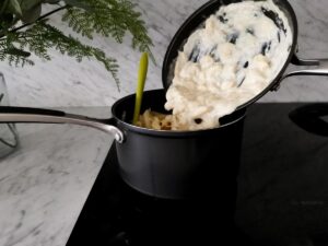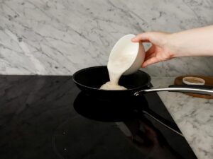 - Add the cooking cream to your pan and season. Let it heat up over the heat.