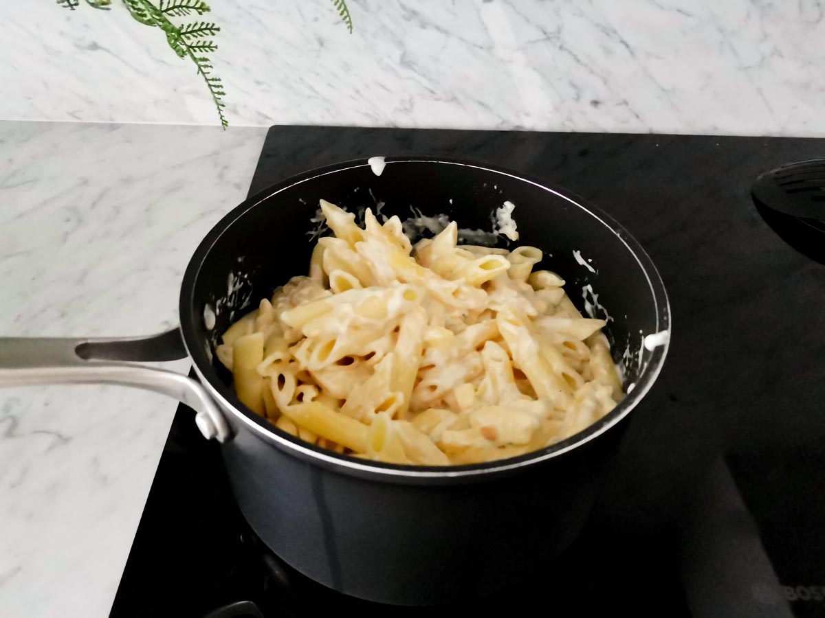 - Add the quattro formaggi pasta sauce to your penne, and mix well.