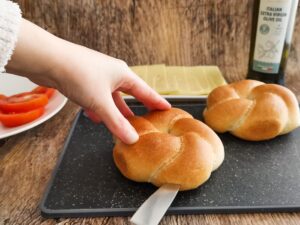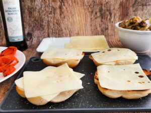 - Top with the last slice or two of cheese, and cover with the top of the bread roll.