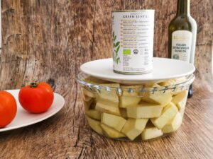 - Use a heavy object to place on the plate and apply pressure on the sliced vegetables
