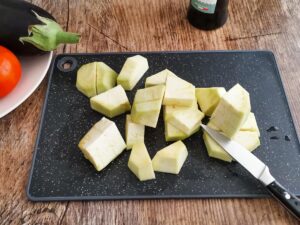 You can also use this fried eggplant recipe but cut the vegetable into cubes and use less oil to fry it. This is what we are doing today to make this recipe healthier.