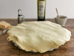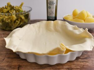 - When you are ready to start assembling the scacciata, take out only one sheet of pastry. Remove it from the paper and layer it on your greased dish.