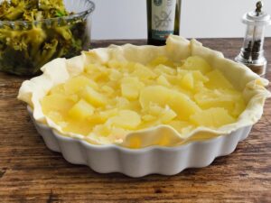 - Top the pastry with a thick layer of sliced potatoes, making sure there's still room for the broccoli layer. Season with salt and pepper.