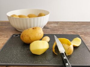 - Wash and peel your potatoes. Leave them whole and boil them.