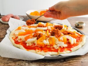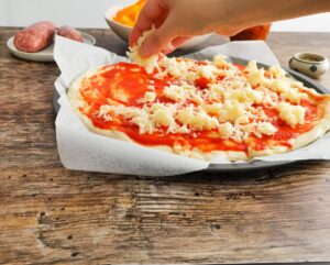 - Spread your tomato sauce, enough but not too much that it makes the pizza liquid. If you are using frozen homemade tomato sauce, add a little less as it tends to be slightly more watery.