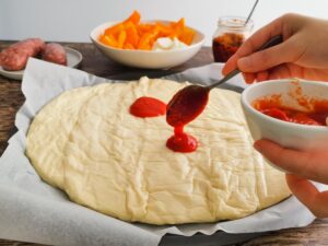 - Take your pizza dough and lay it on a dish with a fresh sheet of parchment paper.