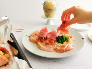 - Proceed by adding the prosciutto crudo. I like to roll mine and add about three or 4 rolls. Try to place them towards the center of the chicken.