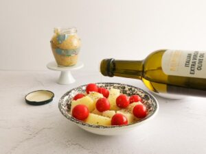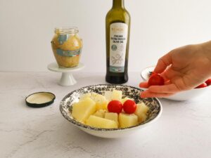 - In the meantime, you can make your salad. Simply add in the washed cherry tomatoes with the potatoes in a bowl. Season with salt and pepper, and add some oregano.
