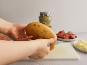 - Firstly, wash and peel your potatoes. Cut them into chunks. We will make a potato and cherry tomatoes salad to go along the stuffed chicken.