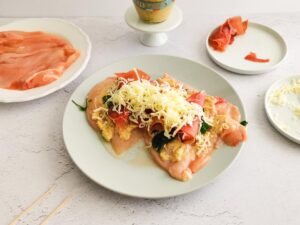 - Finish the chicken stuffing by adding the shredded mozzarella cheese, about a handful and a half for each chicken breast.
