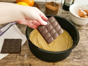 - Take your chocolate bar and break it into two halves. Add one half to the centre of your cake, and then stack the other half on top. Make sure your cake batter covers the chocolate.This will create a melted chocolate heart in the centre, but only when the cake is warm. I always warm up my slice in the microwave, anyway.Otherwise, you can cut the chocolate into squares and spread them evenly across the batter.