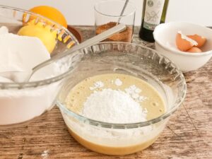 - It's time to add the dry ingredients, that is the flours you previously prepared in your other bowl. Add 1/3 of that mixture to the wet mixture, and beat.