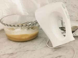 - Add the flour, potato starch, and baking powder mix to your medium sized bowl. Mix well to incorporate everything together; set aside.