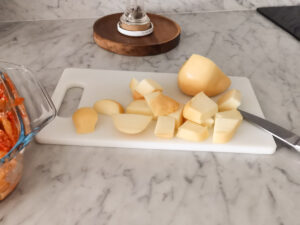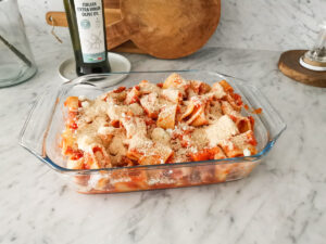 - Transfer to a baking dish and add the Scamorza cheese into large pieces scattered throughout the dish.