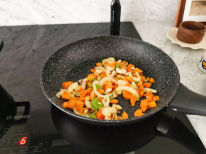 - Sauté the veggies with the celery stalk in the EVOO. Use all 3 tablespoons.