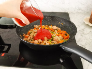 - Now, add the tomato passata, mix well, lower the heat, and leave to simmer for 15 to 20 minutes.