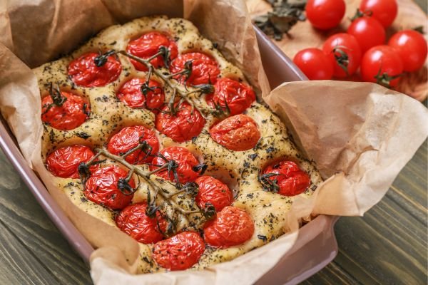 Focaccia Barese stands out with its unique dough, a blend of finely ground semolina flour and the quintessential “00” pizza flour, with the addition of a little mashed potato. This unconventional ingredient imparts an extra fluffiness to the dough, setting the stage for the toppings. Prepared in a round metal baking pan, the dough is adorned with fresh, uncooked tomatoes and olives, a sprinkle of oregano, and a generous drizzle of olive oil. The result is a heavenly treat, crispy on the outside, soft on the inside, and exploding with Mediterranean flavors.