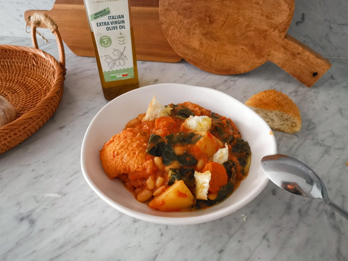 Take the ribollita soup off the heat, serve, and drizzle some Novello EVOO.
